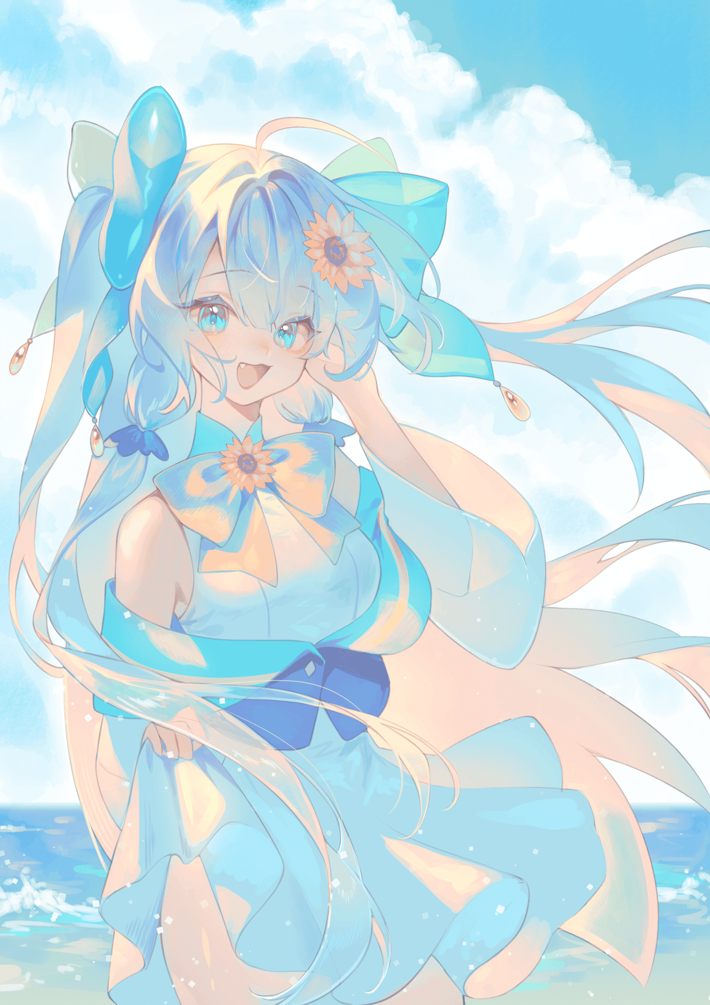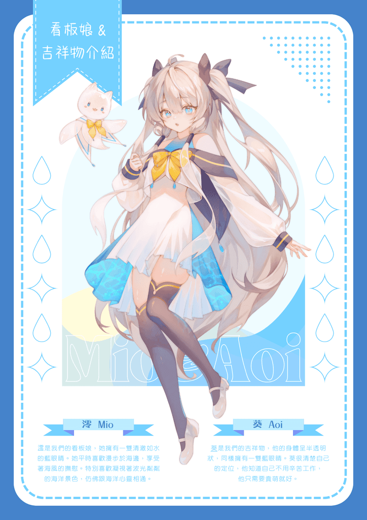 澪(Mio)是我們的看板娘,她擁有一雙清澈如水的藍眼睛。她平時喜歡漫步於海邊,享受著海風的撫慰。特別喜歡凝視著波光粼粼的海洋景色,仿佛跟海洋心靈相通。